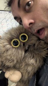 Wizard hat with Muppet aspects made out of leather embroidery thread, beads, odds and ends. It has eyes, nose, ears as well as two levers in the ears that move the antenna/ eyebrows. Try number two on eyes.